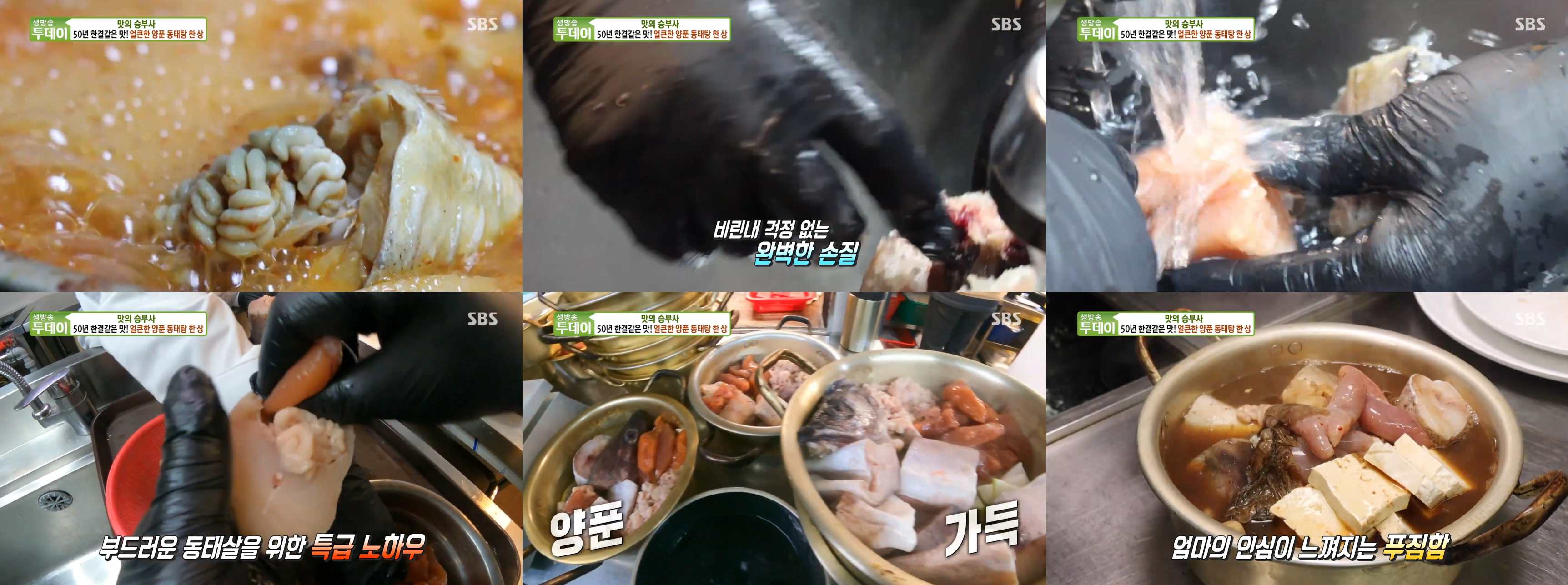 동태 손질의 핵심은 신선도 유지와 잡내 제거로 매일 새벽부터 1500마리의 동태를 손질하는 과정에서 내장과 핏물을 깨끗하게 제거한 후, 알과 고니를 다시 채워 넣어 살이 부서지지 않고 단단하게 유지합니다. 손질을 마친 동태는 양푼에 한가득 담아내는 것이 특징이며 집에서 엄마가 끓여주는 것처럼 푸짐한 양과 깊고 시원한 국물 맛이 일품입니다.