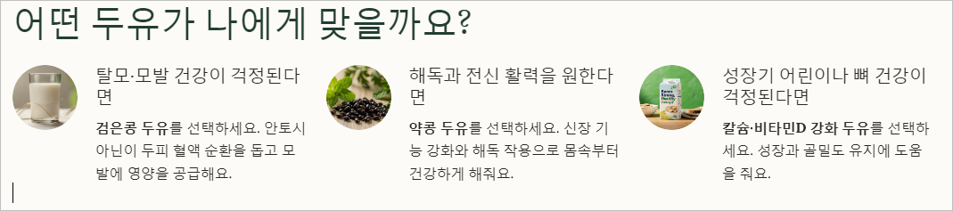 -마지막으로 가장 '내 건강 목표'에 맞춰 고르는 거예요. 모발 건강이 걱정이라면 검은콩 두유를, 전반적인 신체 활력과 해독을 원한다면 약콩 두유를 고르는 식이죠.