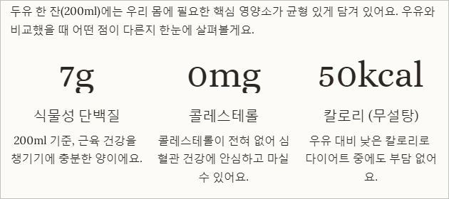 - 고형분 함량: 제품 뒷면의 고형분(콩의 농도) 퍼센트가 높을수록 진하고 영양가 높은 두유입니다.