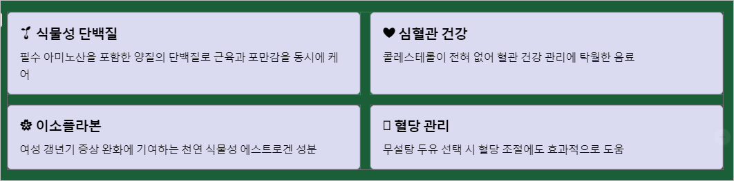 그래서 근육 건강을 챙기거나 포만감을 유지하는 데 도움이 돼요. 필수 아미노산도 골고루 함유되어 있어서 우리 몸에 필요한 영양소를 공급하는 데 좋고요. 두유는 콩으로 만들었잖아요. 콩에 있는 이소플라본이라는 성분은 여성 갱년기 증상 완화에도 기여한다고 알려져 있어요.
