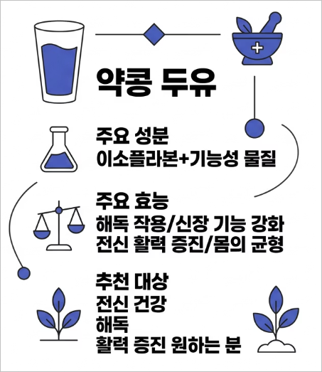 해독 작용이나 신장 기능 강화에 좋다고 알려져 있고요. 그래서 신체 해독이나 전반적인 건강 증진을 원할 때 약콩 두유를 선택하는 경우가 많아요. 검은콩이 특정 부분(모발, 항산화)에 집중한다면, 약콩은 좀 더 전반적인 몸의 균형과 기능을 돕는다고 볼 수 있어요.