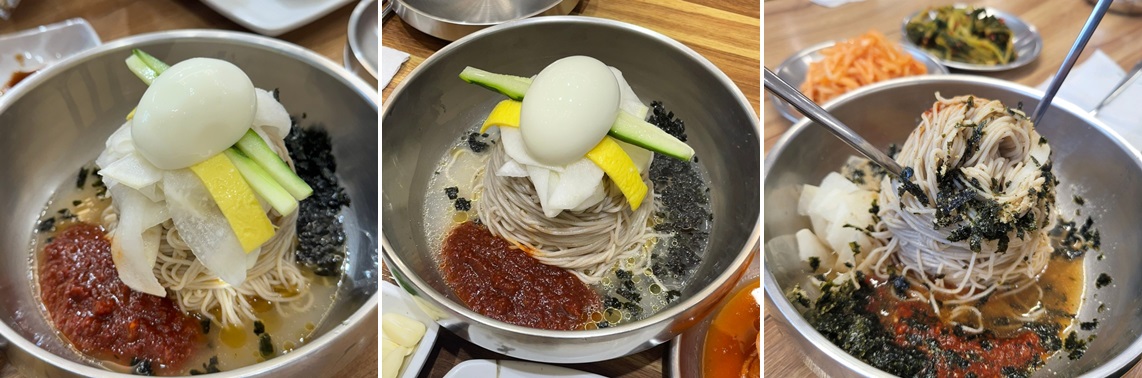 • 메밀면의 마법: 100% 순메밀은 시간이 지나면 면이 금방 불 수 있어요. 나오자마자 들기름과 양념을 슥슥 비벼서 바로 드시는 게 가장 맛있답니다.