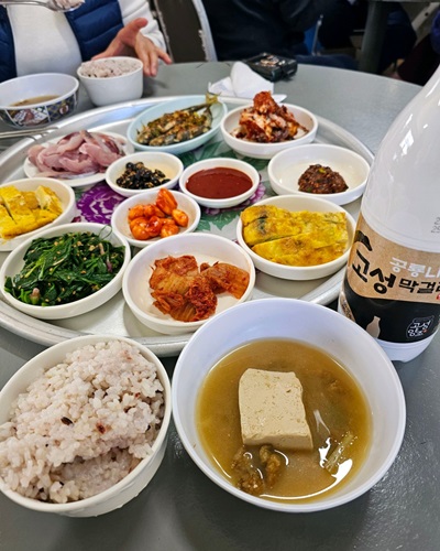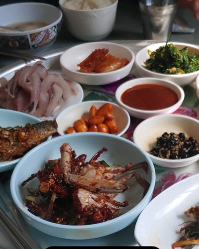 - 10가지 이상의 반찬: 양념게장, 달걀부침, 각종 나물, 구수한 된장국 등이 한 상 가득 차려져요.