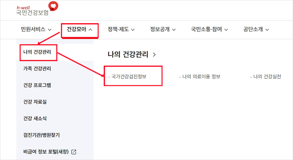 홈페이지에서는 건강모아 -> 나의 건강 메뉴-> 국민건강검진정보에서 신청할 수 있습니다. 이때 로그인을 해야하는데 간편로그인 또는 공동인증서, 금융인증서 중 한가지를 선택하시면 됩니다.
