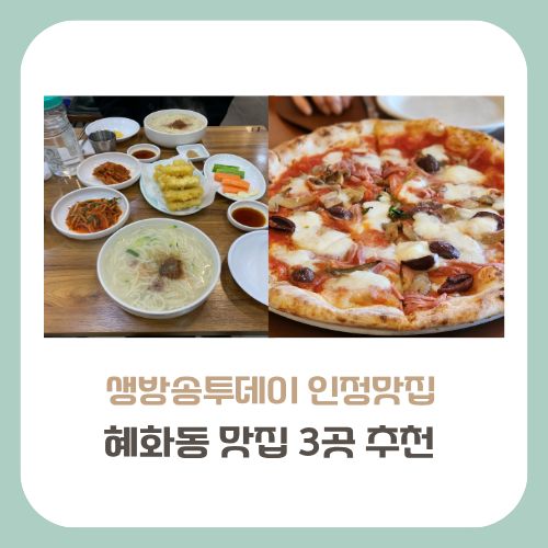 2026년 최신 빅데이터가 선정한 생방송투데이 혜화 인정 맛집 BEST 3 정보를 상세히 정리해 드립니다. 40년 전통의 혜화칼국수, 한국 최초 나폴리 피자 디마떼오, 집밥 같은 솔나무길된장예술까지! 대학로 데이트와 가족 외식에서 실패 없는 현지인 추천 명소의 대표 메뉴, 가격, 방문 꿀팁을 지금 바로 확인해 보세요.