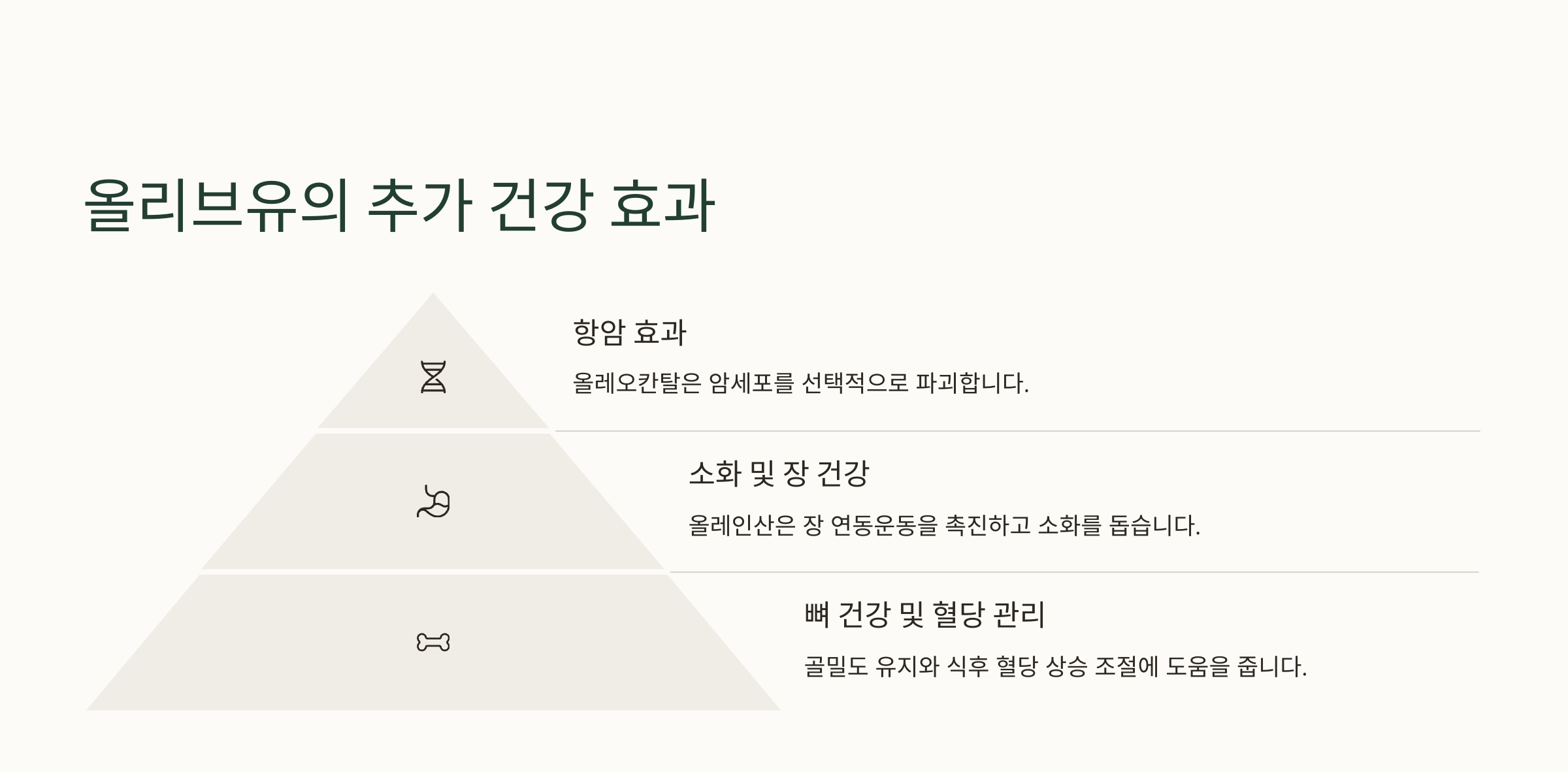 최근 연구에 따르면 올레오칸탈은 암세포만을 선택적으로 파괴하는 작용이 있어 암 예방 및 치료 보조제로서도 주목받고 있습니다. 특히 유방암 재발을 90% 가까이 억제한 연구 결과도 발표된 바 있습니다.