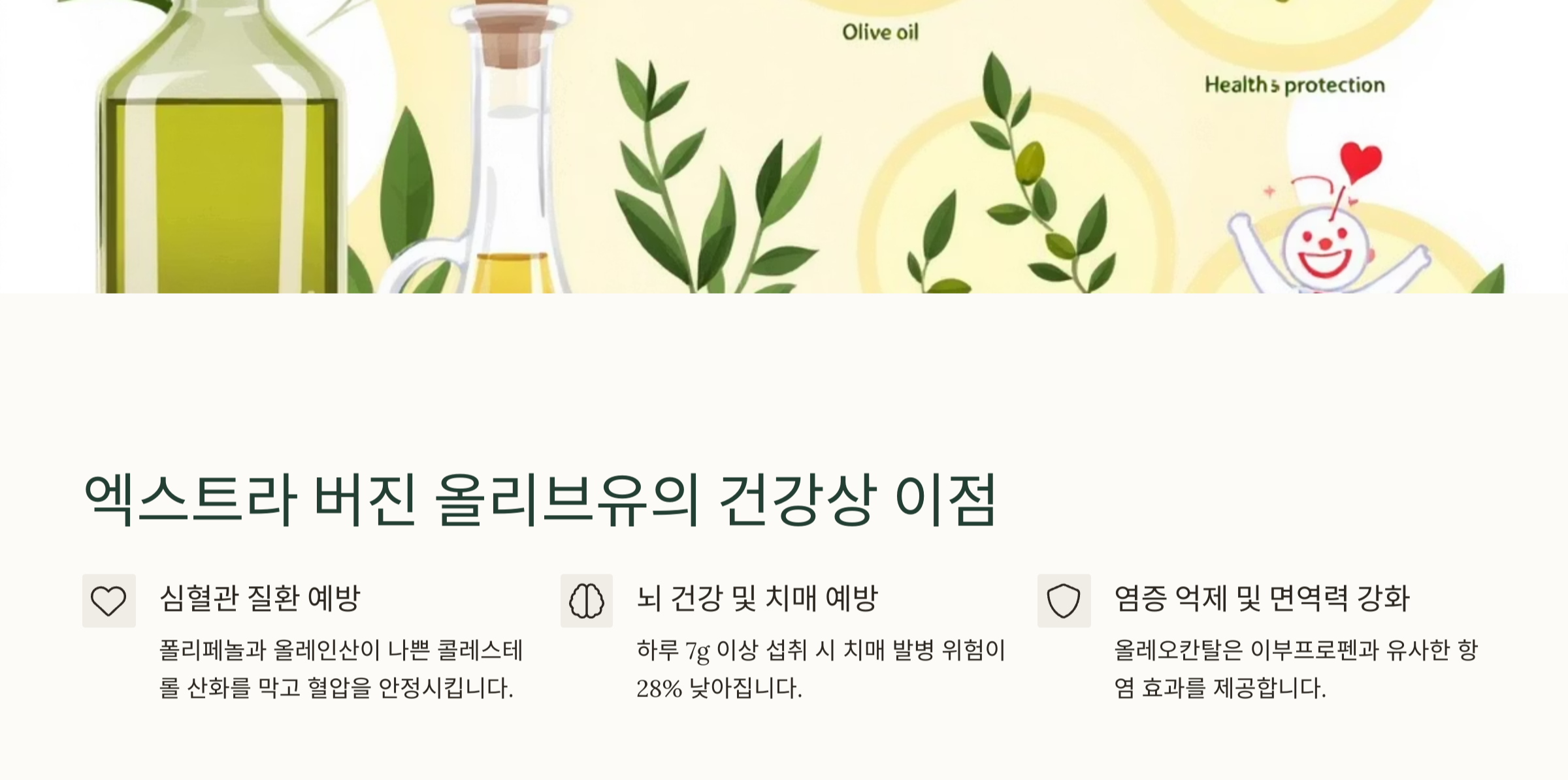 엑스트라 버진 올리브유는 인체 건강을 위한 강력한 기능성 식품으로 평가받고 있는데요. 다양한 항산화 성분과 불포화지방산이 풍부하게 들어 있어 심혈관 질환 예방, 두뇌 건강 보호, 염증 억제 등 전반적인 건강 유지에 도움을 줍니다.