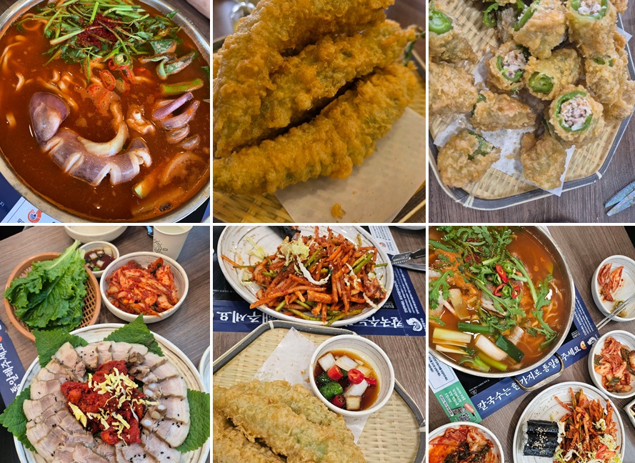 이 외에도 통오징어 칼국수, 항정살 수육, 바지락 두부 두루치기, 고추튀김(오고튀), 돈까스, 황태무침 보쌈, 충무김밥, 오징어초무침 등이 준비되어 있습니다. 특히 오징어 고추튀김은 ‘겉바속촉’ 그 자체로, 거의 모든 테이블에서 주문하는 인기 메뉴입니다. 그리고 아이들이 좋아하는 돈가스 메뉴도 있어 걱정없이 방문할 수 있어요.
