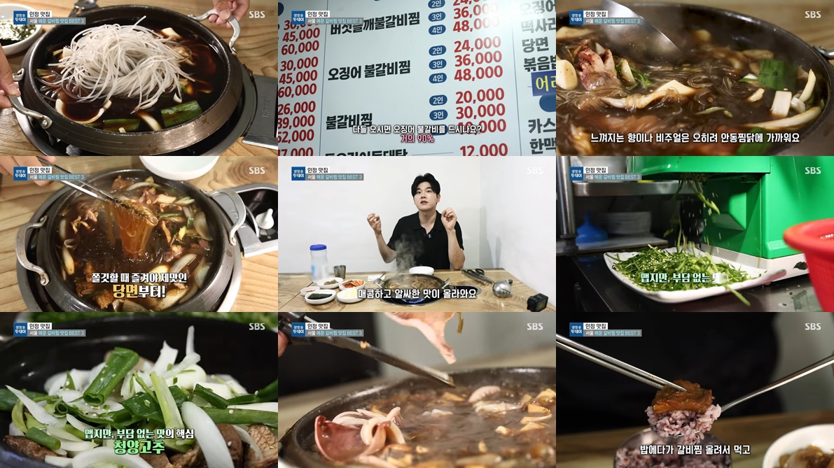 서울 중구 을지로 골목에 위치한 ‘전주옥’은 통오징어불갈비찜으로 유명한 곳입니다. 불향 가득한 갈비찜에 커다란 오징어 한 마리가 통째로 들어가 바다와 육지의 맛을 동시에 느낄 수 있다는 점에서 시청자들의 시선을 사로잡았습니다.처음 보면 붉은 색이 아닌 안동찜닭처럼 보이지만, 당면에 양념이 배어들어 첫입부터 알싸한 매운맛이 올라옵니다.