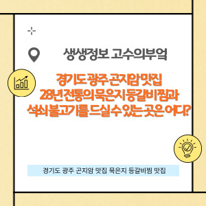 경기 광주 맛집 '곤지암 웅골'은 28년 전통을 자랑하는 묵은지 등갈비찜과 석쇠 불고기로 유명합니다. 깊게 숙성된 묵은지와 고수의 손맛이 어우러진 등갈비찜, 과일양념으로 촉촉하게 구운 석쇠 불고기는 2TV 생생정보에도 소개되며 큰 인기를 끌고 있습니다.