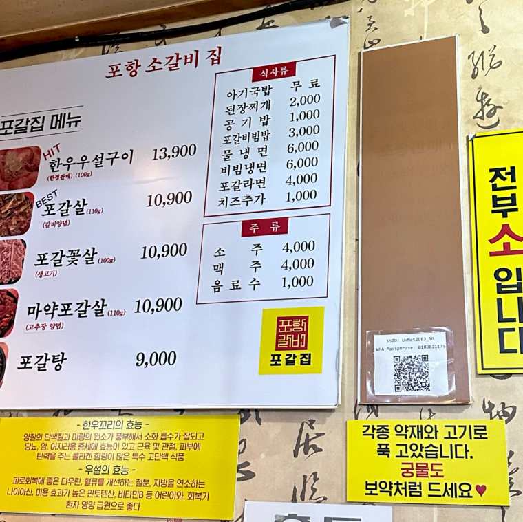 포갈집은 간장과 고추장 두 가지 양념 소갈비살을 즐길 수 있는데요. 포항에 방문하면 꼭 먹어봐야하는 포항 1등 맛집으로 생생정보 기다려야 제맛코너에서 소개했습니다. 특히 4인분 이상 주문 시에는 우족탕이 무료로 제공되는데요 일반 곰탕이나 갈비탕보다 훨씬 맛있다고 합니다.