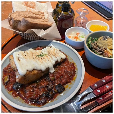 식전 서비스로 피타/호밀빵, 후무스, 샐러드, 토마토 스튜가 무료로 제공되어 구성이 매우 알차요.