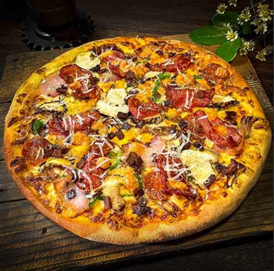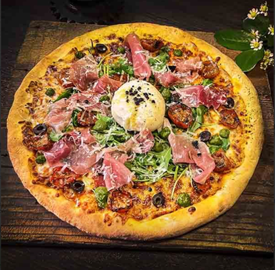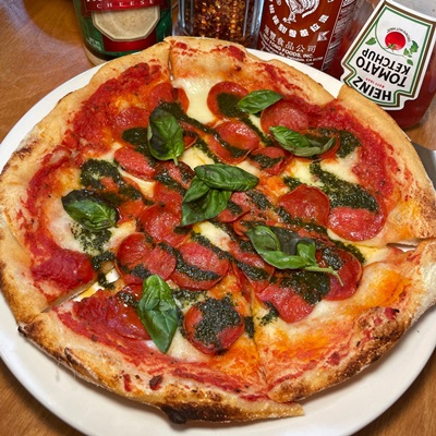 • 부라타그린 피자: 신선한 부라타 치즈가 올라간 올드문래의 시그니처 피자예요. (38,000원)