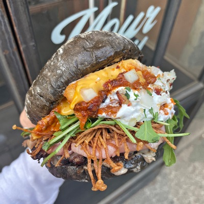• 문래버거(시그니처): 흑미 치아바타 번, 트러플 마요, 잠봉, 그리고 바삭하게 튀긴 팽이버섯이 들어가 풍미와 식감을 모두 잡았어요. (8,900원)
