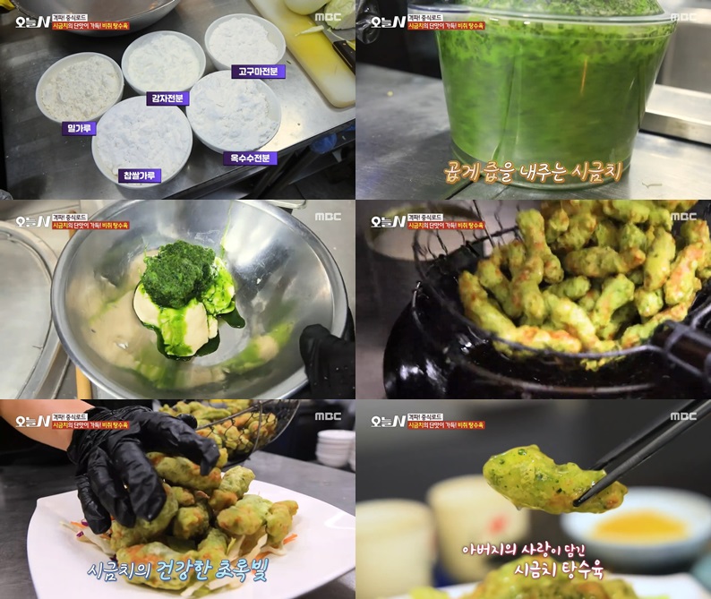 이번 방송의 하이라이트 메뉴는 단연 시금치 탕수육이었습니다. 일반적인 탕수육과 달리, 반죽에 신선한 시금치를 넣어 색감부터 독특했습니다. 초록빛이 은은하게 돌면서도 바삭한 식감을 유지했고, 소스는 새콤달콤하면서도 깔끔한 뒷맛이 인상적이었습니다.