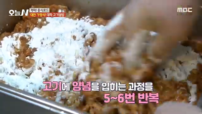 - 돼지고기는 뒷다리살을 사용하며, 후추, 달걀, 중간장 등을 넣고 여러 번 치대어 속까지 간이 잘 배도록 합니다.
