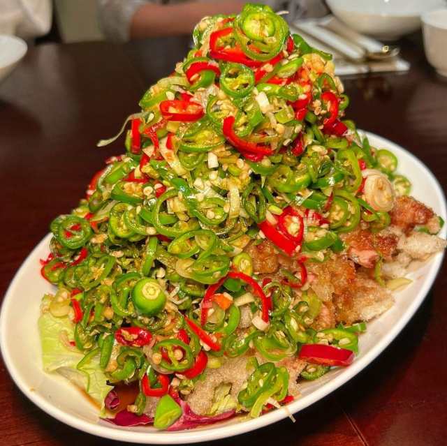 🌶️ 고추 유린기 – 바삭한 닭고기 튀김 위에 다진 고추와 특제 소스를 올려 매콤하면서도 감칠맛 가득한 요리