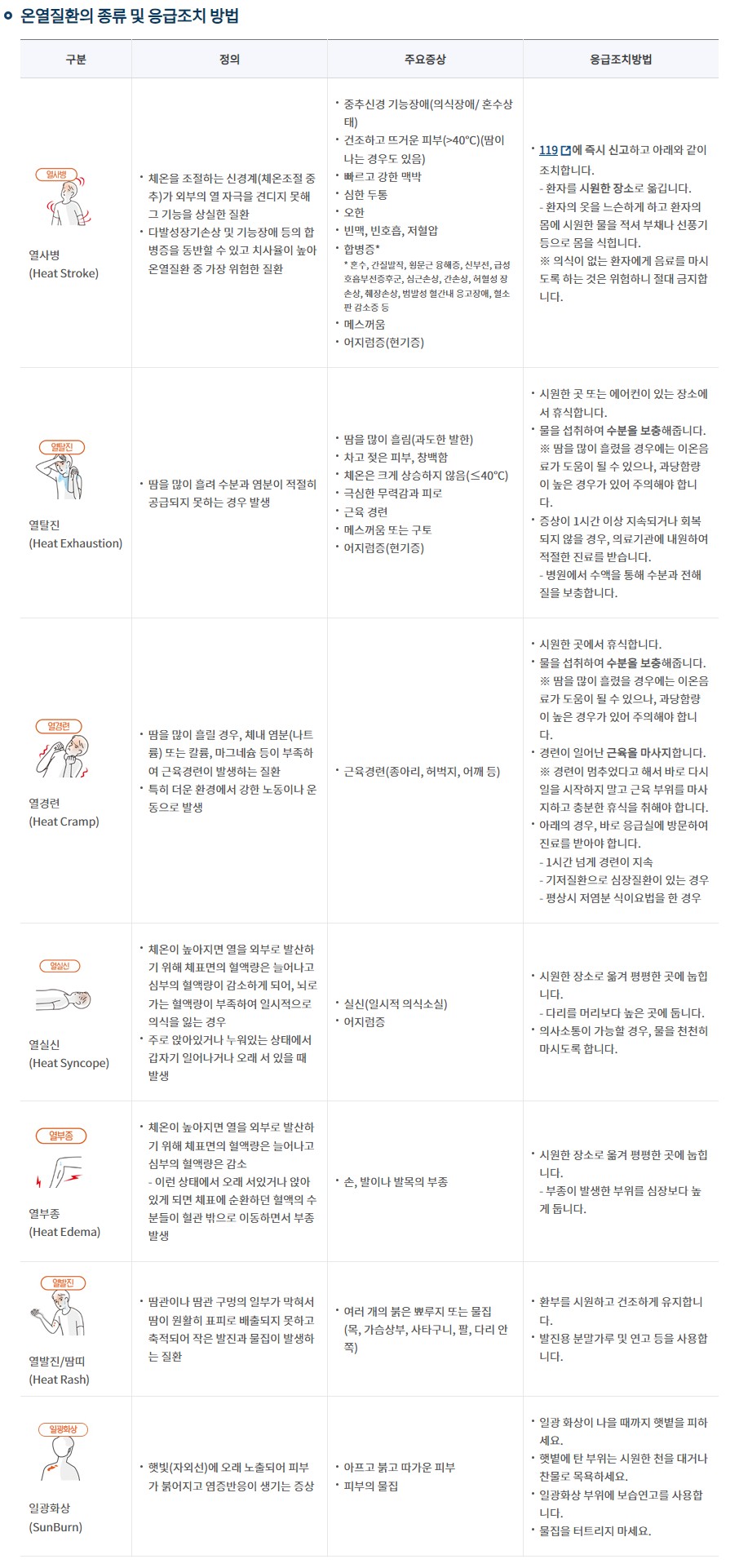 폭염으로 발생할 수 있는 온열질환에 대해 알아봤습니다. 6월 중순임에도 불구하고 매우 더운 날씨인데요 가장 더운 시간에는 야외활동을 자제하시고 기상특보 등을 이용하여 안전하게 생활할 수 있었으면 합니다. 또한 너무 더울 때는 무더위 쉼터 및 서점, 카페 등을 이용하시는 것도 좋은 방법인 것 같아요. 더운 날씨 건강관리 잘하세요.