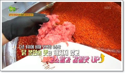 - 비법 양념: 얇게 회를 친 소고기 우둔살을 양념에 넣어 감칠맛을 아주 진하게 끌어올렸네요. 일주일 동안 푹 숙성시킨 이 양념이 닭고기 속까지 깊숙이 배어들어 풍미가 정말 남다르답니다.