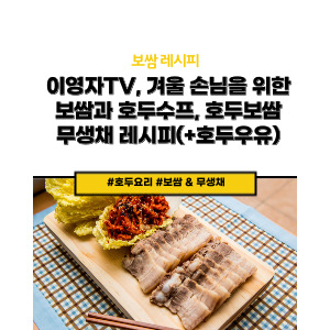 이영자 TV에서는 함박눈이 펑펑 오는 날 4촌 하우스에 배우 정지소 님이 오기로 하여 맛있는 보쌈과 호두 수프, 보쌈을 위한 호두무생채를 준비했어요. 김장철에 많이 드시는 보쌈과 뇌에 좋은 호두를 이용한 호두 우유, 호두수프, 호두무생채 등을 맛있게 만들어주셨는데요. 이에 대한 레시피에 대해 알아보도록 할게요.(다만 배우 정지소 님은 못 오셔서 이영자 님께서 혼자 만찬을 하셨어요)