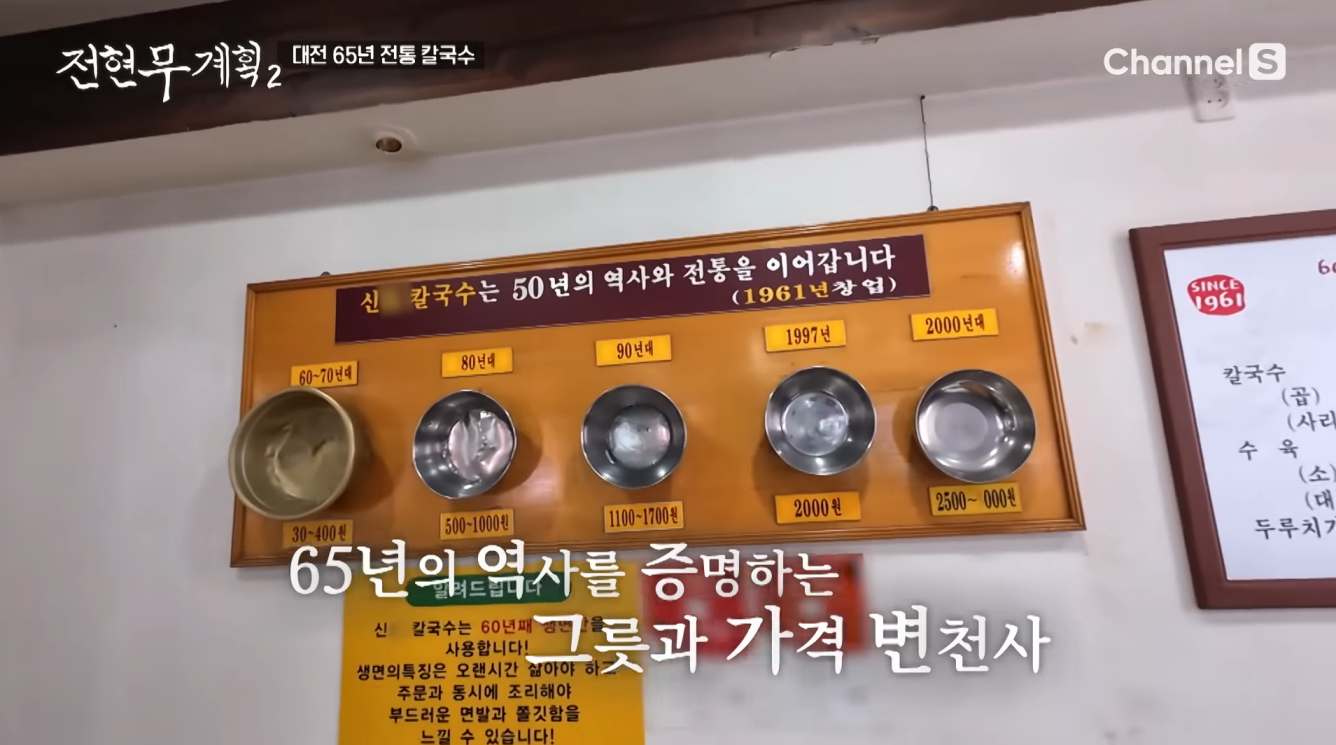 대전의 전통 생면 칼국수 신도칼국수는 매장 곳곳마다 65년의 역사를 증빙하는 그릇과 가격 변천사를 함께 만나볼 수 있어요.