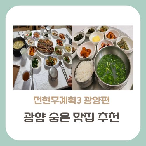 전현무계획3에서 소개된 광양 숨은 맛집 정보를 한눈에 정리했습니다. 벚꽃과 매화가 피는 봄, 광양을 여행한다면 꼭 들러야 할 식당으로 재첩회세트, 갈치조림, 광양불고기까지 알차게 소개합니다. 현지인 강추 로컬 맛집을 만나보세요.