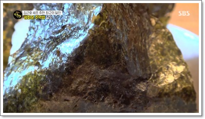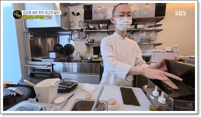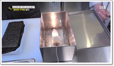 • 특수 김 건조기: 조리대 위에 놓인 네모난 통은 달인이 직접 고안한 김 건조기예요. 열선 전구를 사용해 온도와 습도를 조절하며 김의 해조류 비린내를 날리고 아삭한 식감을 유지해요. 덕분에 뜨거운 밥과 만나도 김이 눅눅해지지 않고 파삭함이 살아있답니다.