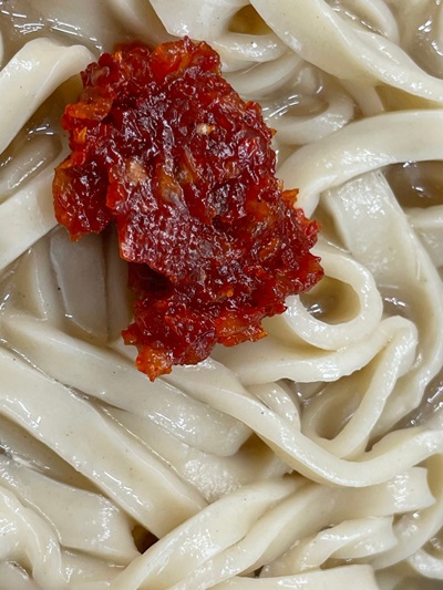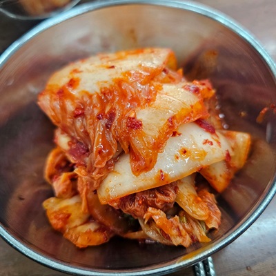 마늘 맛이 강하고 칼칼한 겉절이 스타일이에요. 명동교자 김치보다는 마늘 맛이 덜하지만, 빈속에 많이 드시면 맵게 느껴질 수 있으니 칼국수와 곁들여 적당히 드시는 것을 추천해요.