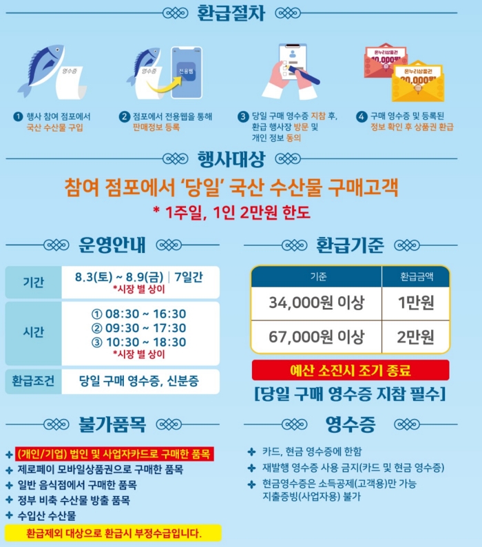 전통시장의 경우 수산물을 일정금액을 이용한 후 해당 영수증을 가지고 온누리 상품권 환급하거나 전용 제로페이를 이용하여 20%선 할인된 금액으로 구매할 수 있습니다. 자세한 내용은 다음과 같습니다.