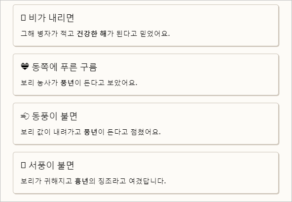 - 바람의 방향: 동풍이 불면 보리 값이 내려가고 풍년이 들며, 서풍이 불면 보리가 귀해진다고 점쳤답니다.