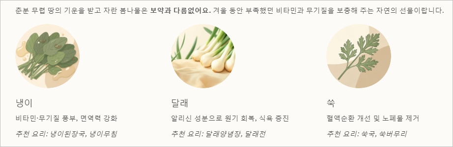 | 냉이 | 비타민, 무기질 풍부, 면역력 강화 | 냉이된장국, 냉이무침 |