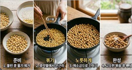 - 볶기: 마른 팬에 중약불로 볶다가 껍질이 살짝 터지면서 고소한 향이 올라올 때 불을 끄세요. 마지막에 천일염 한 꼬집만 넣으면 콩의 단맛이 극대화됩니다.